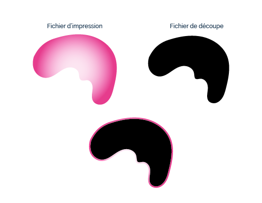 Vous devez nous fournir un fichier, en plus de votre fichier d’impression, comprenant un aplat de noir représentant le placement de la découpe.Le fichier d'impression doit être plus grand de 2mm que le fichier d'aplat noir (bords perdus).