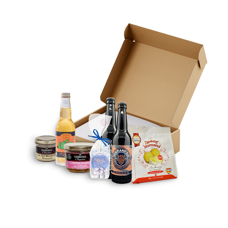 Il contient un jus de pomme artisanal (33 cl) accompagné de deux bières normandes, une American Pale Ale (33 cl) et une IPA (33 cl), parfaites pour un moment de convivialité. Côté salé, la terrine de campagne au Calvados (190 g) et les sablés au camembert (100 g) rappellent la richesse gastronomique locale. Pour terminer sur une note sucrée, les caramels tendres d’Isigny (150 g) et la Teurgoule traditionnelle (90 g) apportent une touche gourmande et authentique.