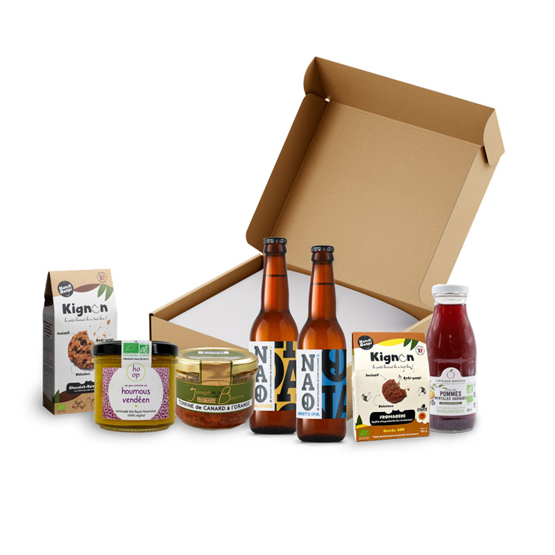 Côté boissons, il associe un jus de pomme (1 L), un Muscadet Tradition (75 cl), une bière blonde (33 cl), une WIPA (33 cl) et une Belgian Pale Ale (33 cl), reflétant la diversité et la créativité brassicole et viticole de la région. Pour le salé, retrouvez une tartinade potimarron, romarin et piment d’Espelette (100 g), un pâté de canard au muscadet (180 g), des sablés sésame & comté (105 g) et des biscuits salés provençaux Bio (100 g), à la fois originaux et savoureux. Enfin, pour conclure sur une note sucrée, les fameuses Rigolettes Nantaises aux fruits (150 g) apportent une touche gourmande et locale.