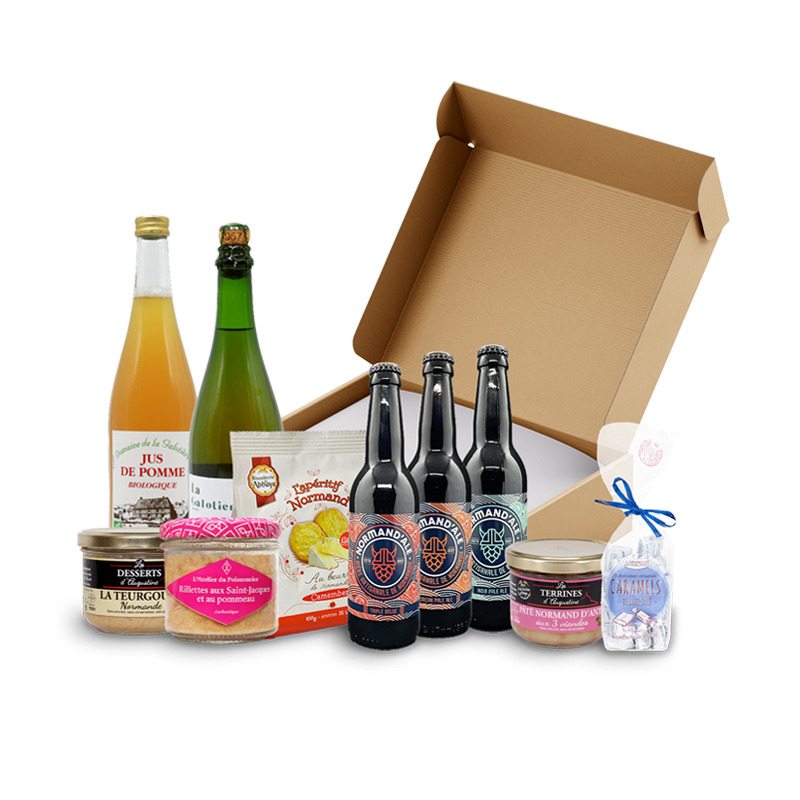 Côté boissons, retrouvez un jus de pomme artisanal (75 cl), un cidre brut du Pays d’Auge (75 cl) ainsi qu’une sélection de bières locales : APA (33 cl), IPA (33 cl) et Triple (33 cl). Pour le salé, le coffret propose un pâté normand d’antan aux 3 viandes (190 g), des sablés salés au camembert (100 g) et de délicieuses rillettes de Saint-Jacques au pommeau (125 g). Enfin, les incontournables douceurs normandes complètent ce voyage gustatif : caramels d’Isigny tendres (150 g) et teurgoule traditionnelle (190 g).