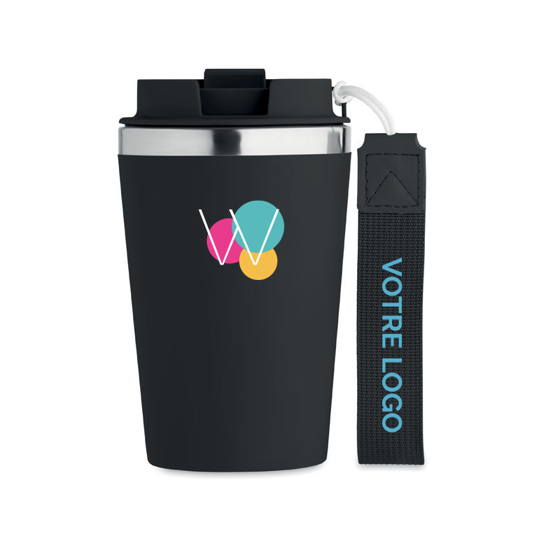 Fabriqué en matériaux robustes et de qualité (acier inoxydable recyclé (90%), couche extérieure en PP et bracelet en RPET), ce gobelet est conçu pour une utilisation quotidienne. Sa finition lisse lui confère un toucher agréable, et il est suffisamment solide pour supporter les usages répétés, au bureau comme en extérieur.
