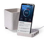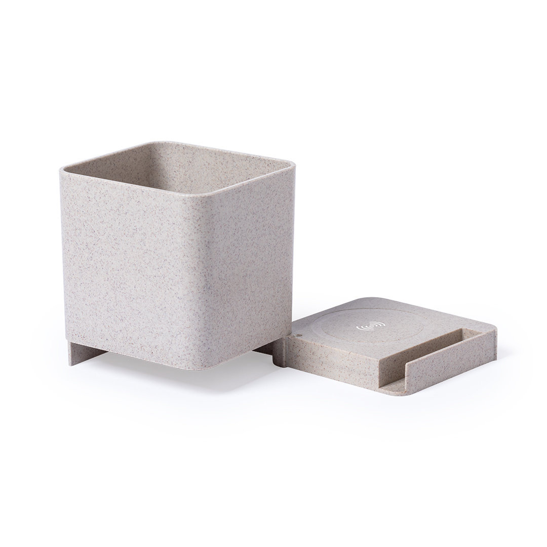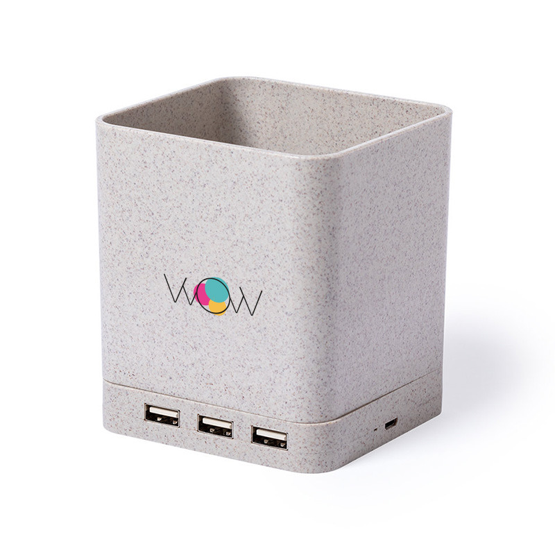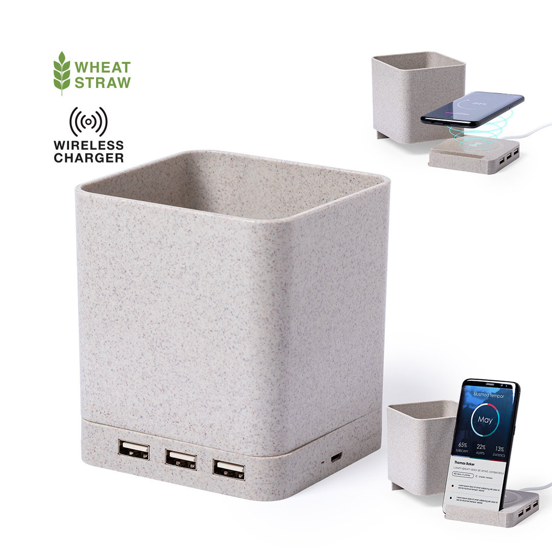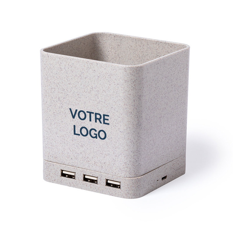 Porte-Crayons Multifonction chargeur sans fil 3 ports USB paille de blé/ABS : cet accessoire de bureau innovant allie praticité et engagement écologique. Fabriqué en paille de blé, matière renouvelable à faible impact, et en ABS, il propose quatre fonctions en un : porte-stylo, support pour smartphone, chargeur sans fil compatible Qi, et hub USB avec 3 ports USB 2.0. Livré avec un câble micro USB d’1 mètre, il facilite la recharge et l’organisation sur le bureau.