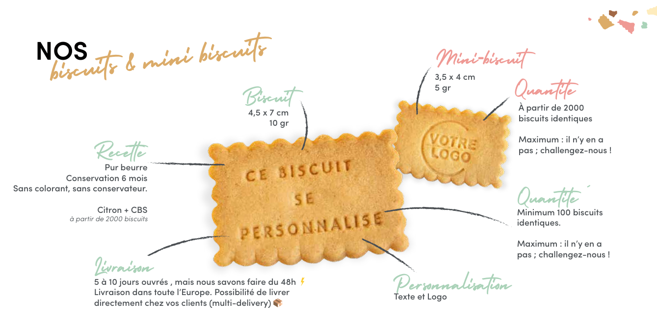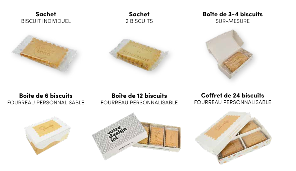 - Biscuit 4,5 × 7 cm - 10 g : pour un visuel parfaitement lisible, ce biscuit se décline en parfum nature (à partir de 20 pièces identiques), et en parfums citron ou caramel beurre salé (à partir de 1 000 pièces identiques). Au-delà de 10 000 pièces demandez-nous un devis!