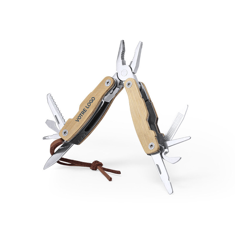WOW & Co vous propose la personnalisation du multi-outil, notamment par gravure sur la poignée en bambou ou marquage discret, afin de valoriser durablement votre identité de marque.