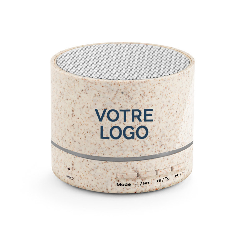 Cette enceinte portable personnalisable proposée par WOW & Co est fabriquée à partir de fibres de paille et d’ABS recyclé (100 % rABS). Son format compact et son design naturel en font un objet à la fois fonctionnel et engagé, parfaitement adapté aux usages nomades et professionnels.