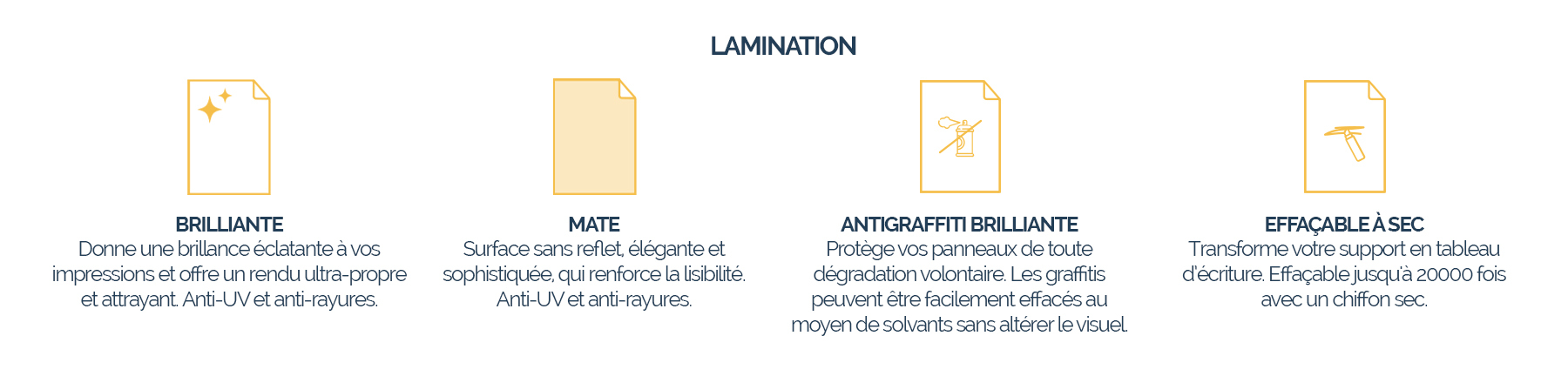 L’impression en quadrichromie haute définition garantit une restitution fidèle de vos couleurs, messages et visuels de marque. Selon vos besoins, des finitions spécifiques comme un contrecollage vinyle, un pelliculage mat ou brillant peuvent être ajoutées pour augmenter la durabilité et l’impact visuel du panneau.