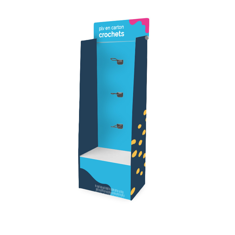 Le présentoir en carton PLV avec crochets proposé par WOW & Co est fabriqué en carton EB robuste, assurant une excellente stabilité et une longue durée d’usage tout en restant léger et recyclable.