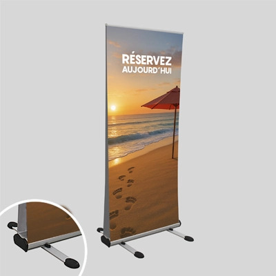 Le Roll’Up Extérieur est spécialement conçu pour vos événements et campagnes en plein air. Sa structure renforcée et sa base lestée assurent une parfaite stabilité face au vent. Fabriqué avec des matériaux résistants aux intempéries, il garantit un affichage impactant et durable, quelles que soient les conditions.